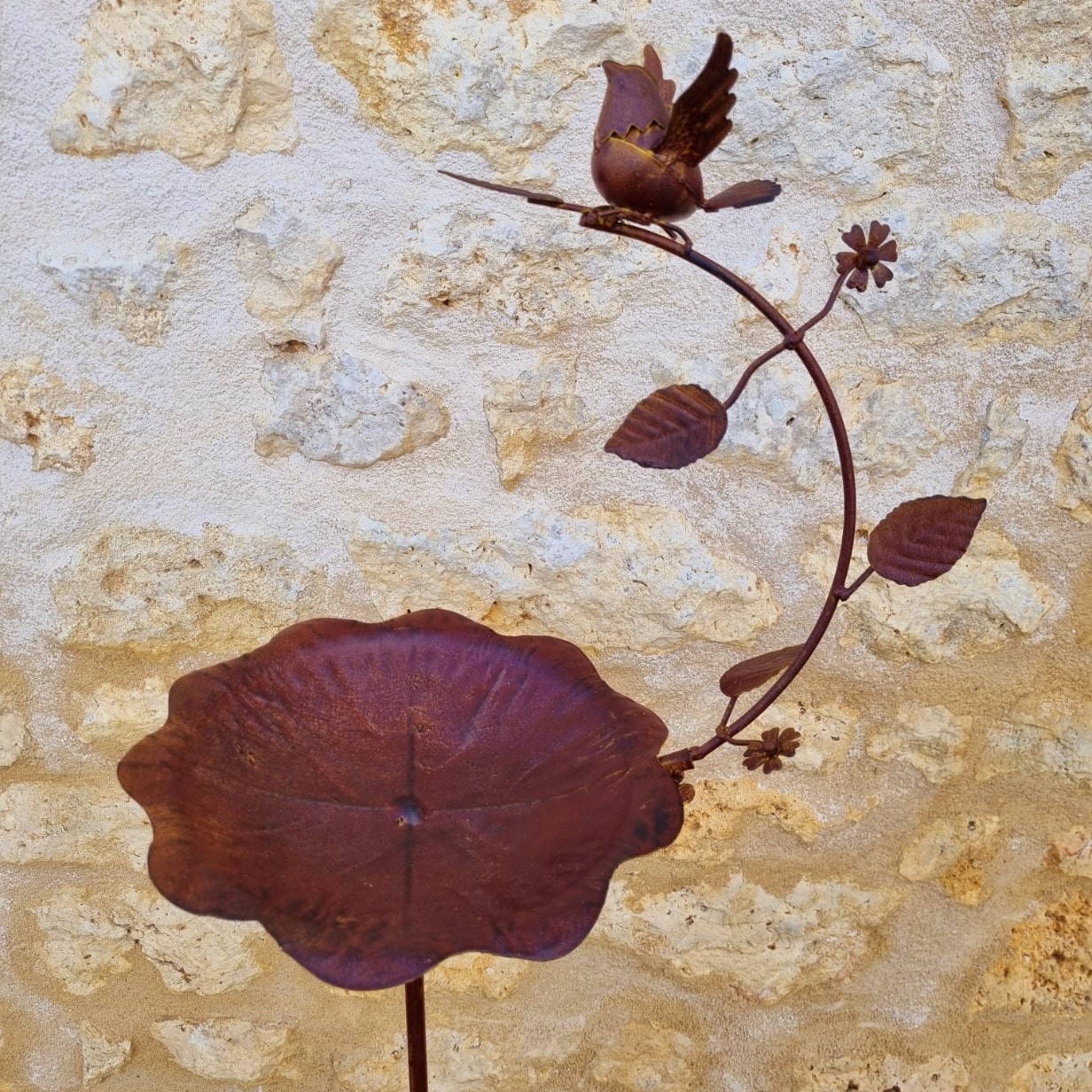 Su cuenco con forma de hoja, práctico y estético, completa perfectamente su diseño poético. Montado sobre una varilla fina con un pincho estabilizador de horquilla, este baño para pájaros se clava fácilmente en el suelo, ofreciendo una estabilidad ideal, incluso en espacios expuestos al viento. El acabado en pintura color óxido le confiere a este producto un aspecto cálido y atemporal que armoniza con cualquier tipo de decoración exterior.