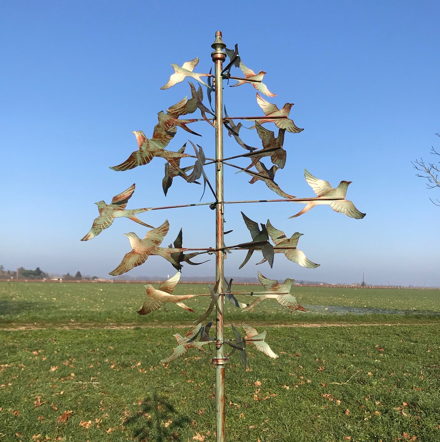 Sus golondrinas de metal patinado en verde azulado y cobre crean una ilusión de vuelo sincronizado, mientras que su poste robusto con fijación reforzada garantiza una estabilidad óptima, incluso en días ventosos.