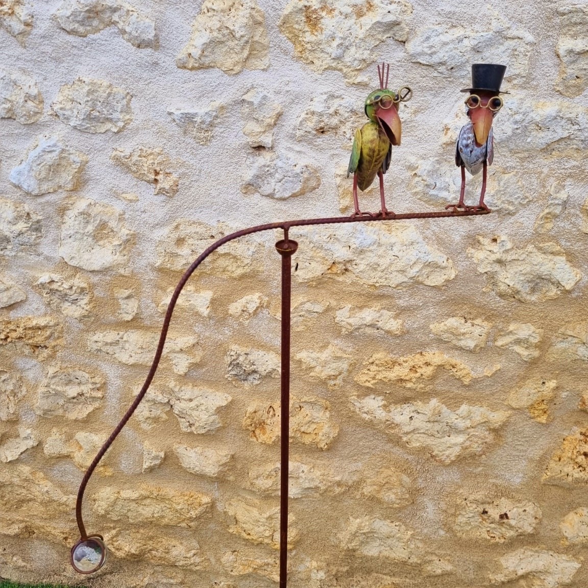 Su postura, equilibrada sobre una varilla elegantemente ondulada, da la impresión de que están a punto de debatir temas serios... o de comentar tus habilidades como jardinero. Fabricado en metal pintado, este pincho decorativo resiste las inclemencias del tiempo manteniendo sus colores vivos y su encanto único. Con una brisa ligera, se mueve suavemente, aportando vida y movimiento a tu jardín.